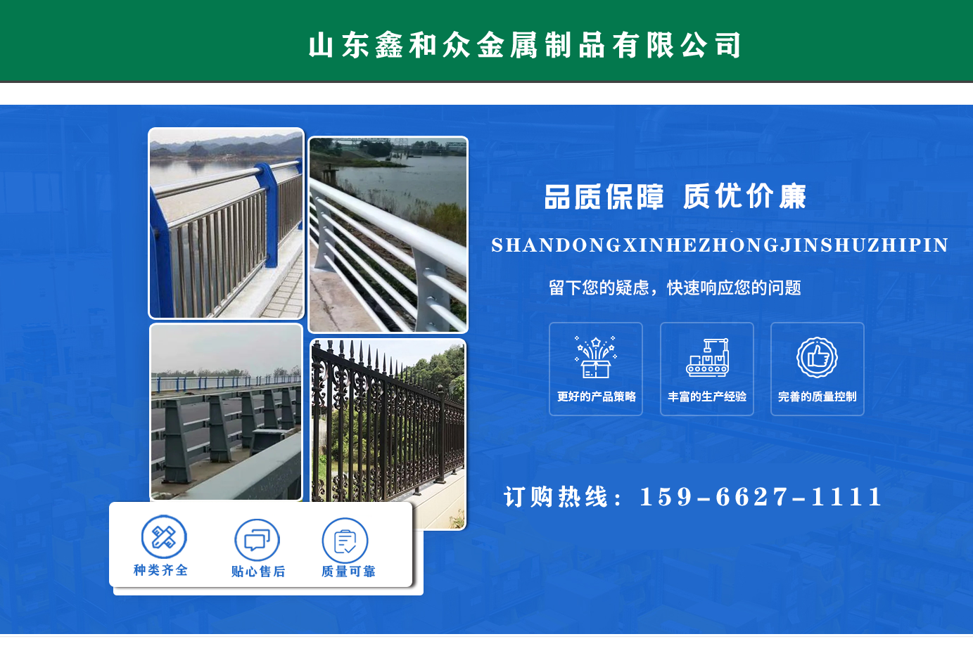 山東鑫和眾金屬制品有限公司主要產(chǎn)品有防撞護欄,橋梁護欄,道路護欄,河道護欄,不銹鋼護欄等護欄。提供設計方案,一站式定制,包您滿意價格優(yōu)惠,歡迎來電咨詢!    公司常年從事銷售護欄防撞護欄,橋梁護欄,道路護欄,河道護欄,不銹鋼護欄,橋梁鋼護欄,河道燈光護欄等。產(chǎn)品廣泛應用于橋梁、河道、旅游景區(qū)、道路、公路、公園、小區(qū)、景觀、道路防撞等領域。    公司產(chǎn)品均采用優(yōu)質(zhì)不銹鋼材料,符合相關標準。各種型號不銹鋼復合管及護欄,質(zhì)量嚴格把控。產(chǎn)品強度高、耐腐蝕、焊接牢固、抗沖擊、性能好,防撞護欄結(jié)構(gòu)簡單、美觀實用大方。     歡迎前來訂購!...